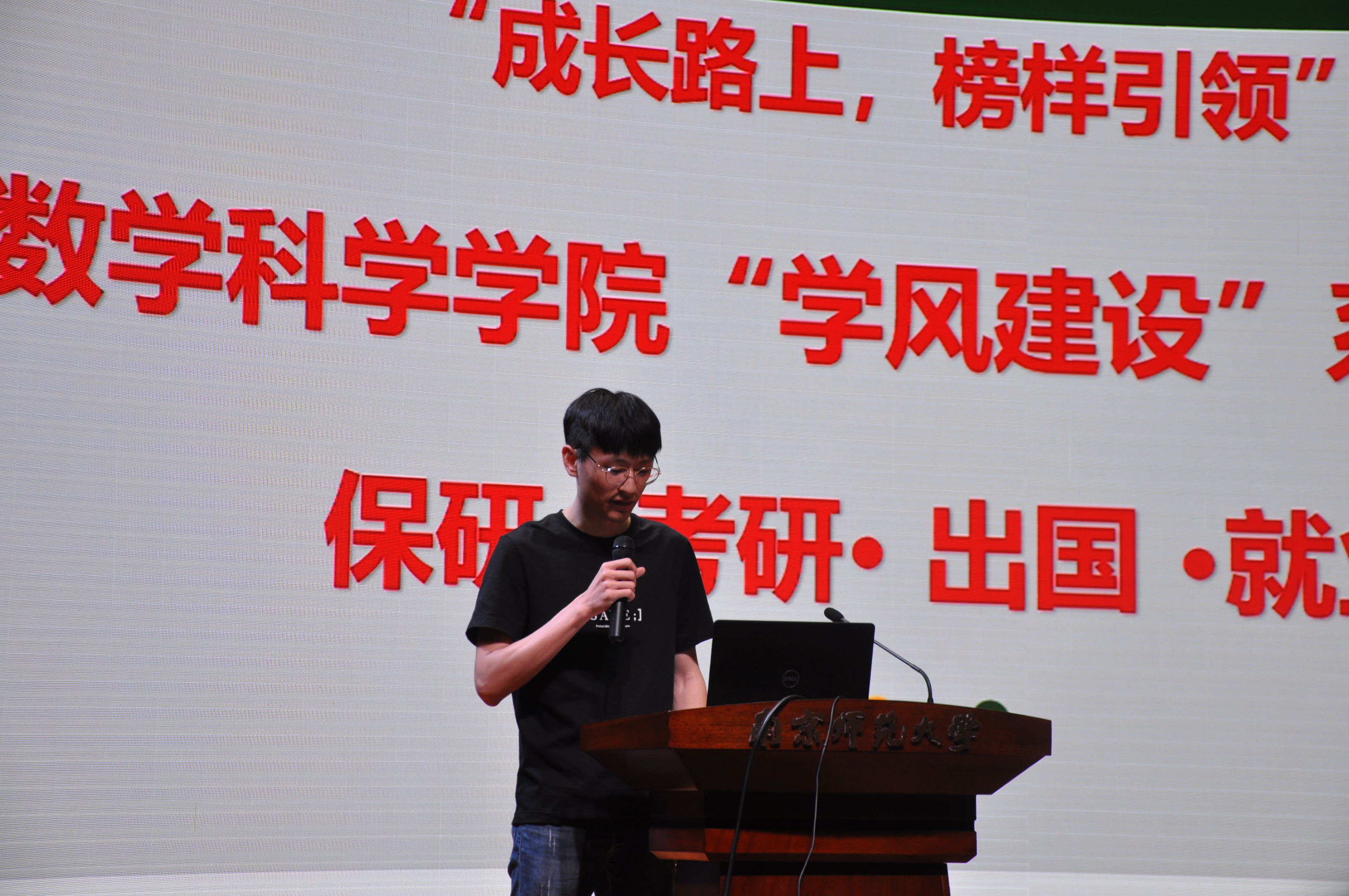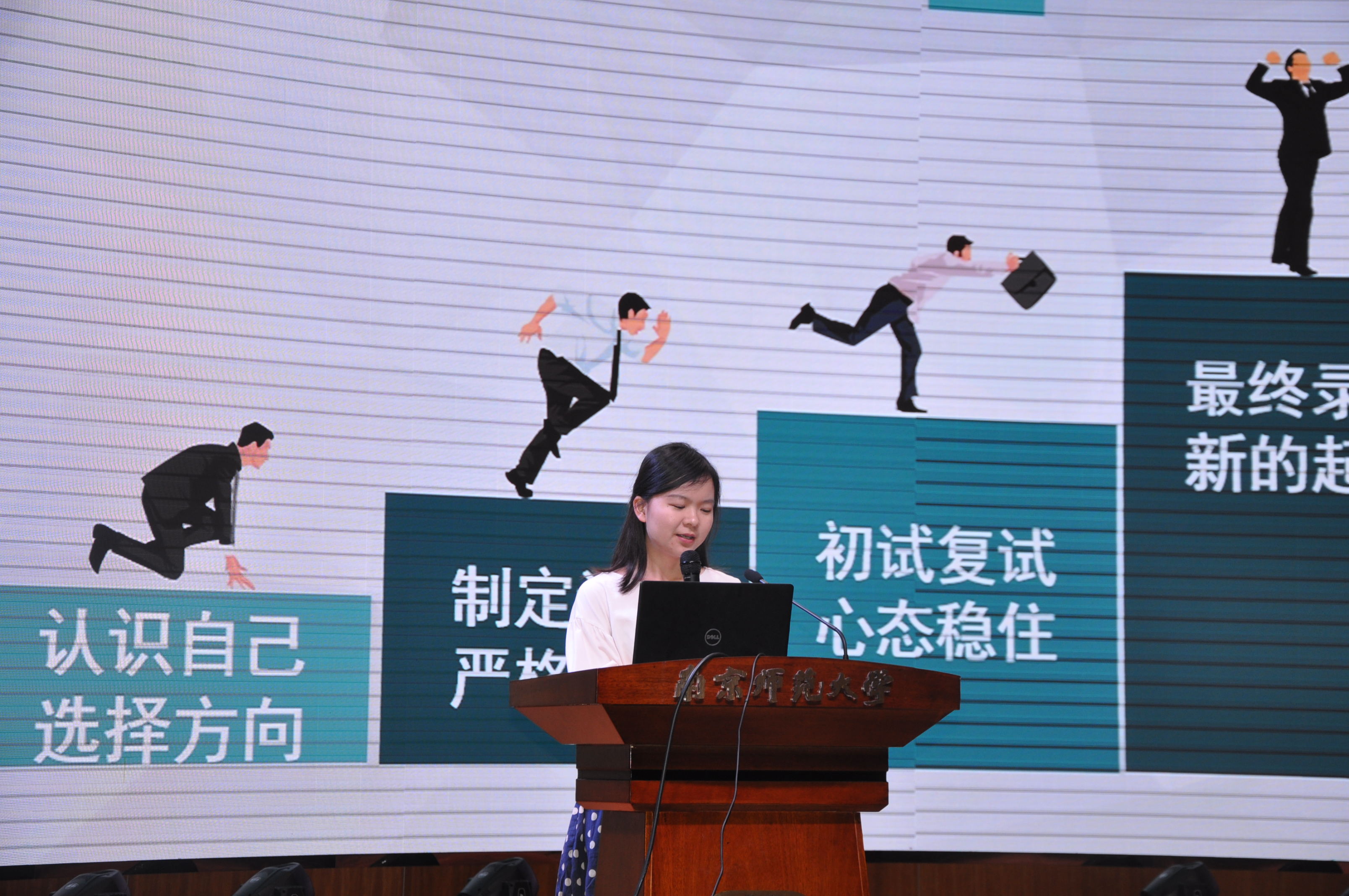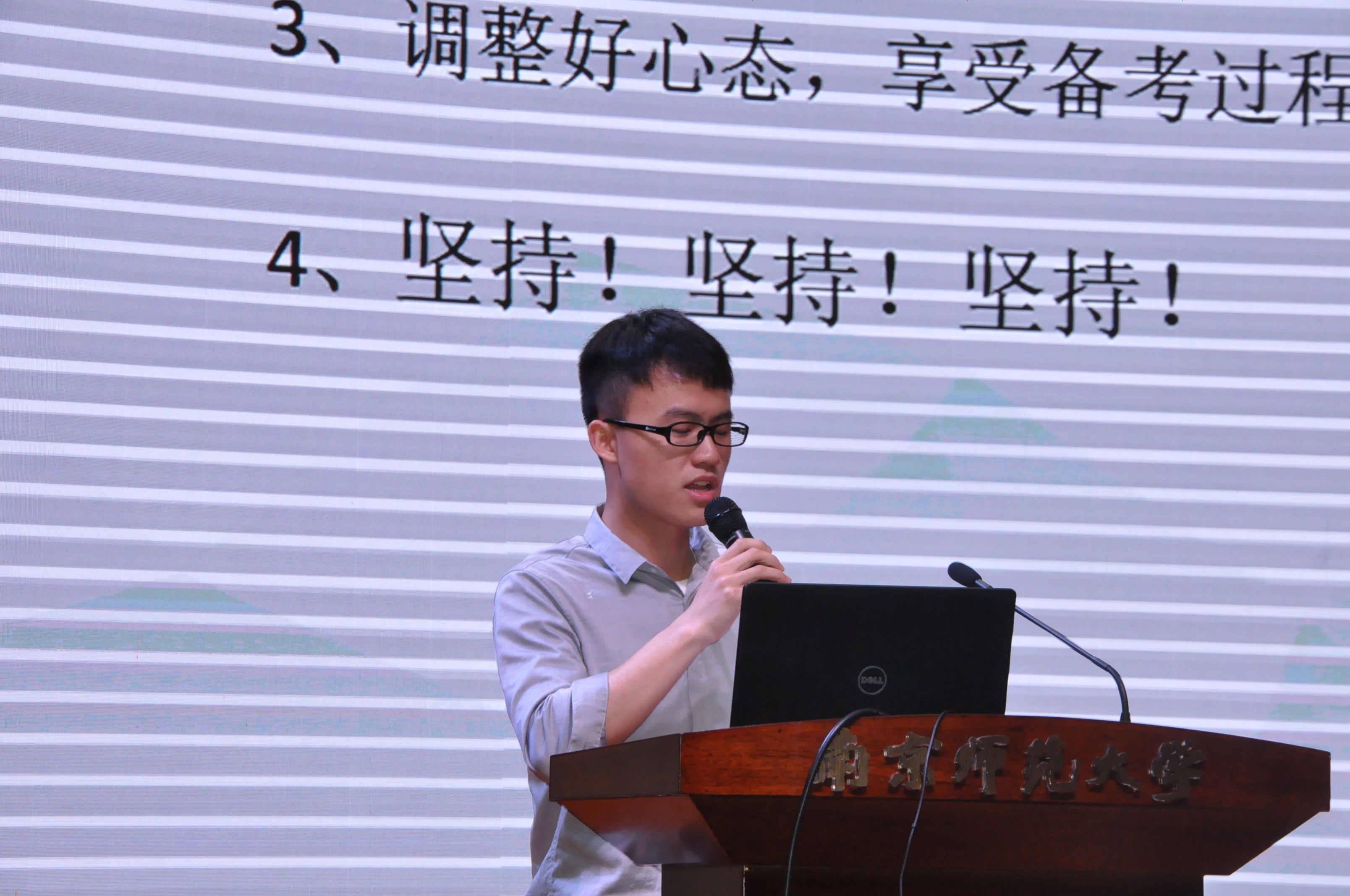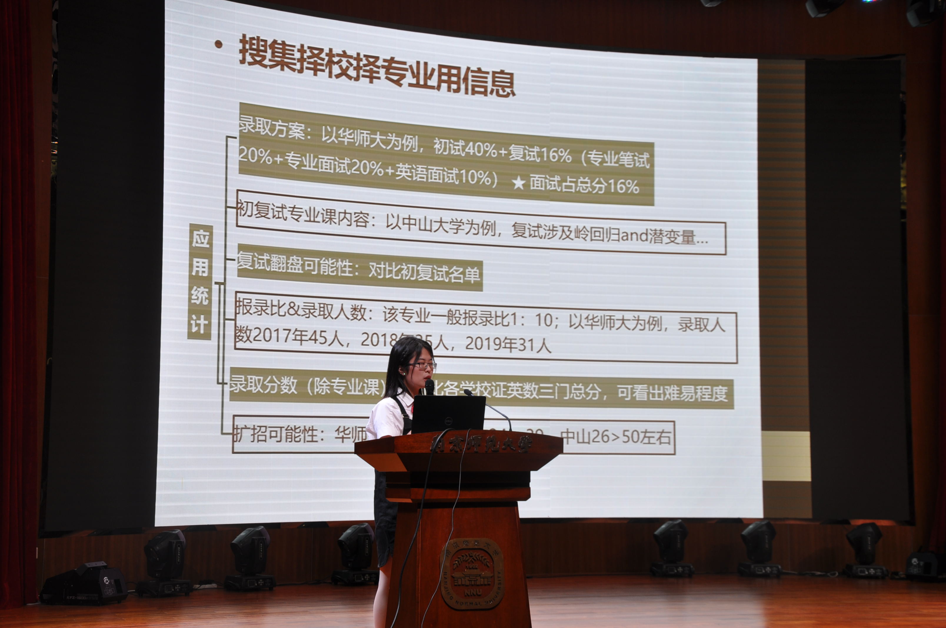 统计学专硕)。他从华为CEO任正非的话切入讲述了选择本校应用统计专业的心路。讲述了考本校的优势和本校复试方式。告诉大家要注意考研信息的获取,特别是招生指标和往届录取情况,这些信息可以去中国研究生招生信息网寻找,以及各学校的研招网等。一般在九月初各学校的研招网会发布当年研究生招生简章,会有各个专业的拟录取人数和考试参考书目。对于往届的情况,也会有好心的学长学姐在贴吧,微博等地方post出来,大家平时多动动手指头就可以找到,当然也有一些考研qq群和微信公众号,里面会有考研资讯和往届情况。此外,他特别提醒大家,南师大考研的历年试卷在西区大活的二楼有售,同学们可以前往购买,提前了解专业课出题风格。