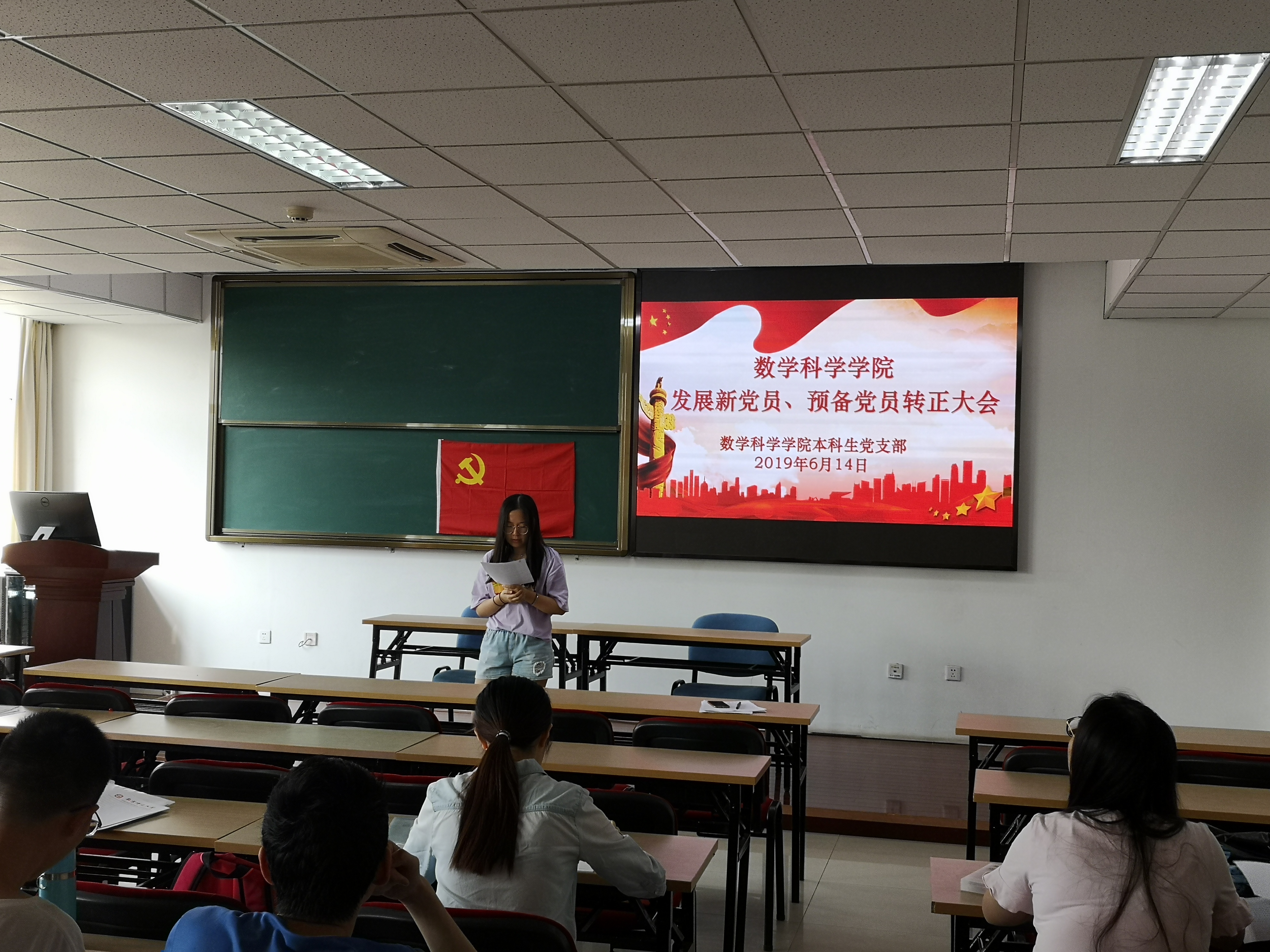 6月14日下午,行健楼526教室,数科院本科生党支部在这里召开了本支部党员组织发展和转正大会。参加本次大会的学生党员共有36人,其中正式党员15人,预备党员21人,大会由支部书记陈文瑜同学主持。