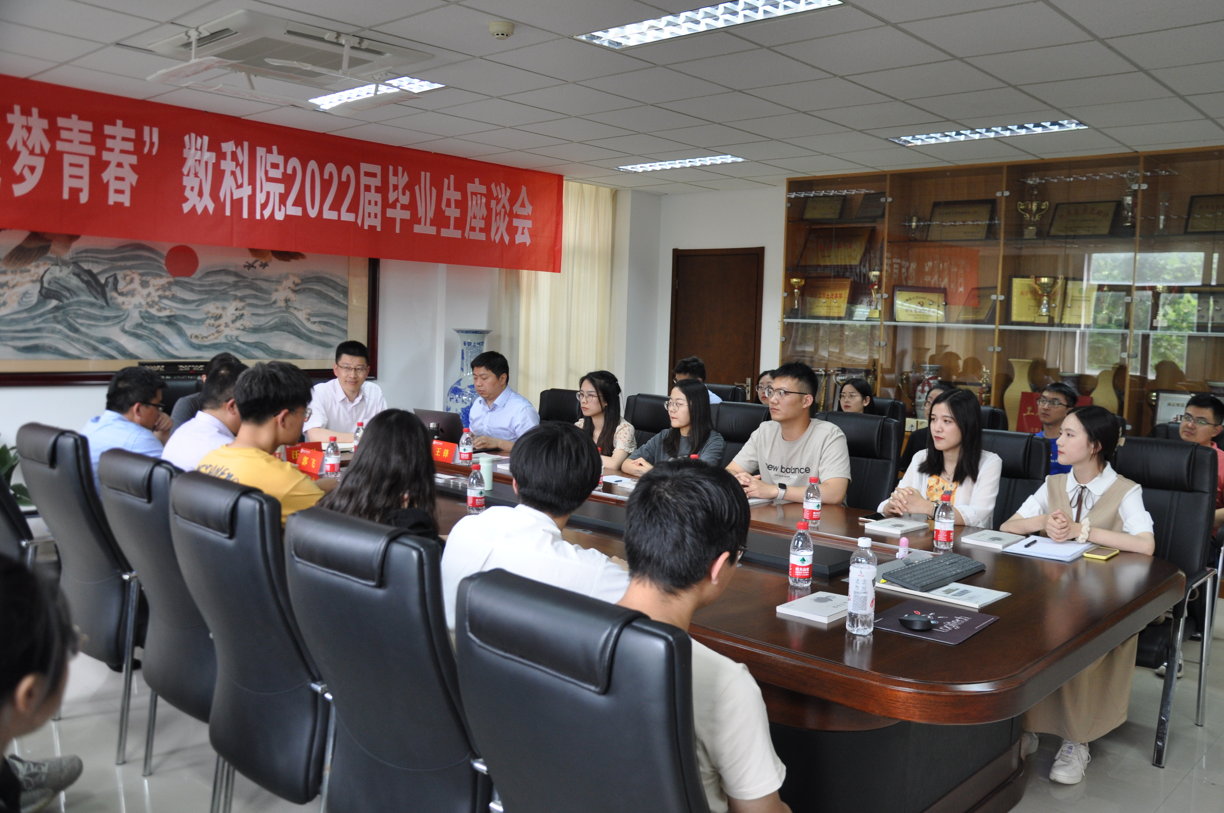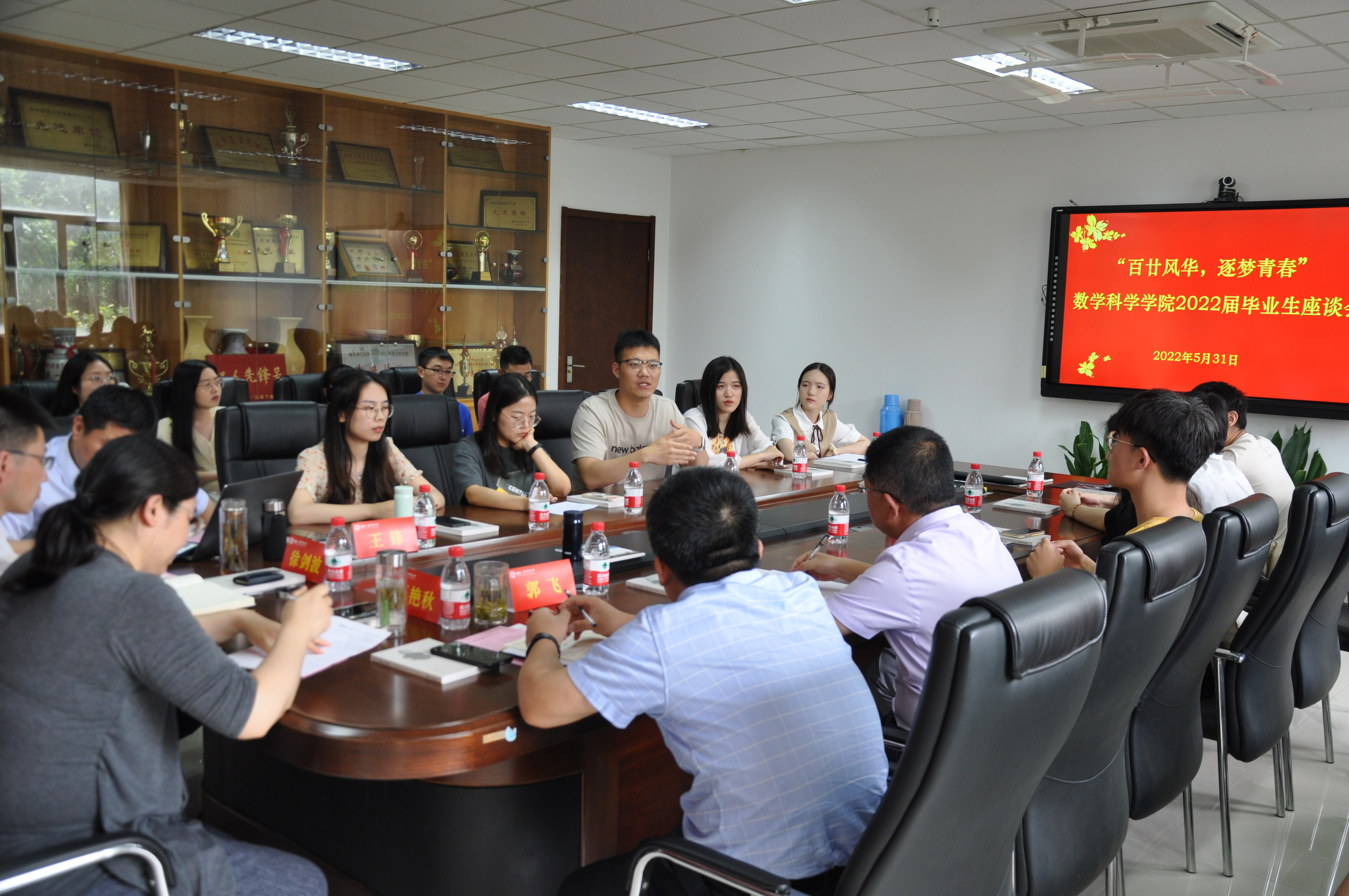 在行健楼544室召开2022届毕业生座谈会。数科院院长汪艳秋、院党委书记徐剑波、副院长郭飞、王锋及20余位本、硕、博毕业生代表参加了座谈会,会议由数科院党委副书记喻华杰主持。