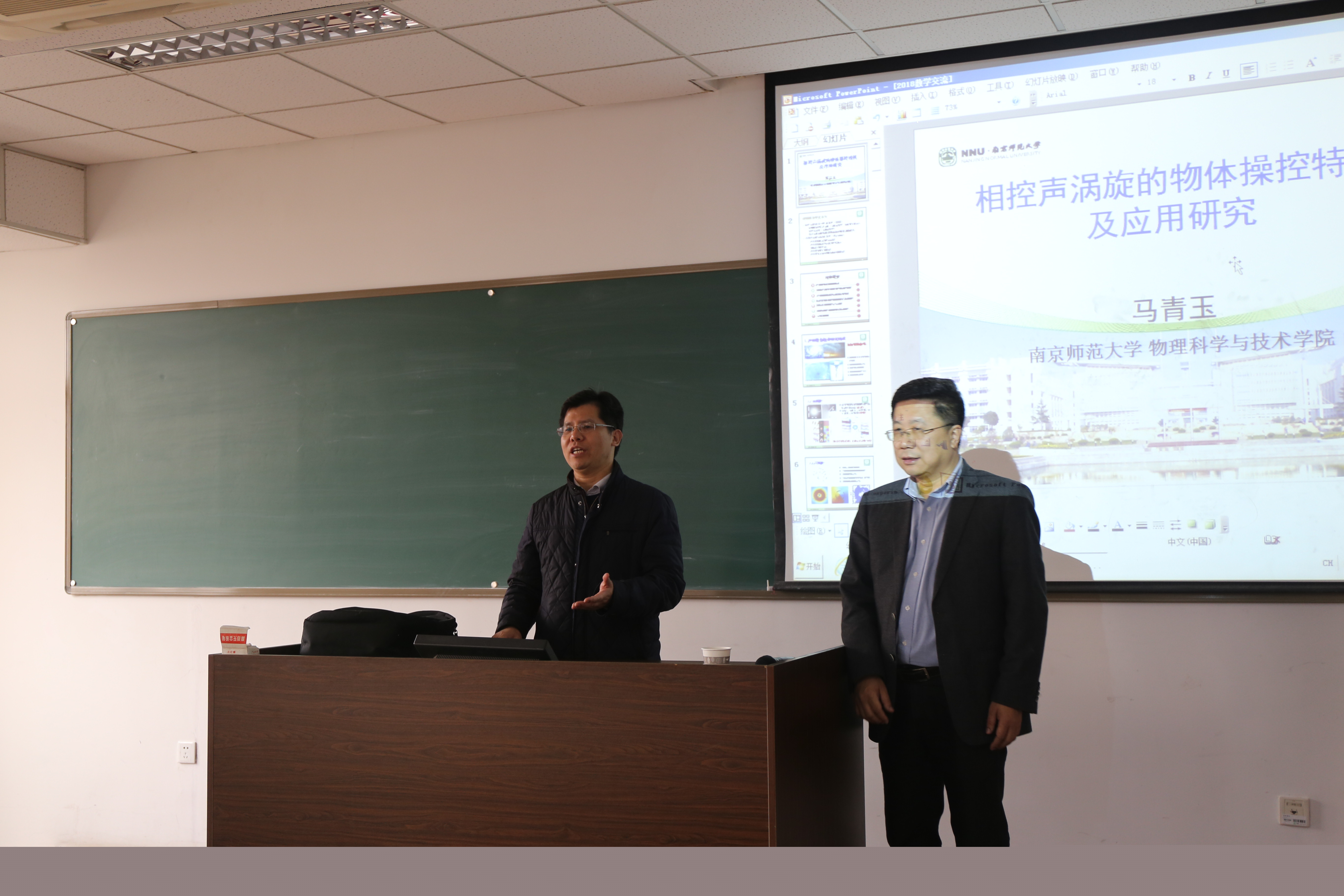 在本次报告会上,马青玉教授作了题为“相控声涡旋的物体操控特性及应用研究”的学术报告。马青玉教授首先介绍了利用相位编码技术形成可控声涡旋的基本原理以及该项技术在实际医疗的广阔应用前景,然后对多种编码方法产生的声涡旋分别从模拟和实验的角度进行了详细地展示和比较。
