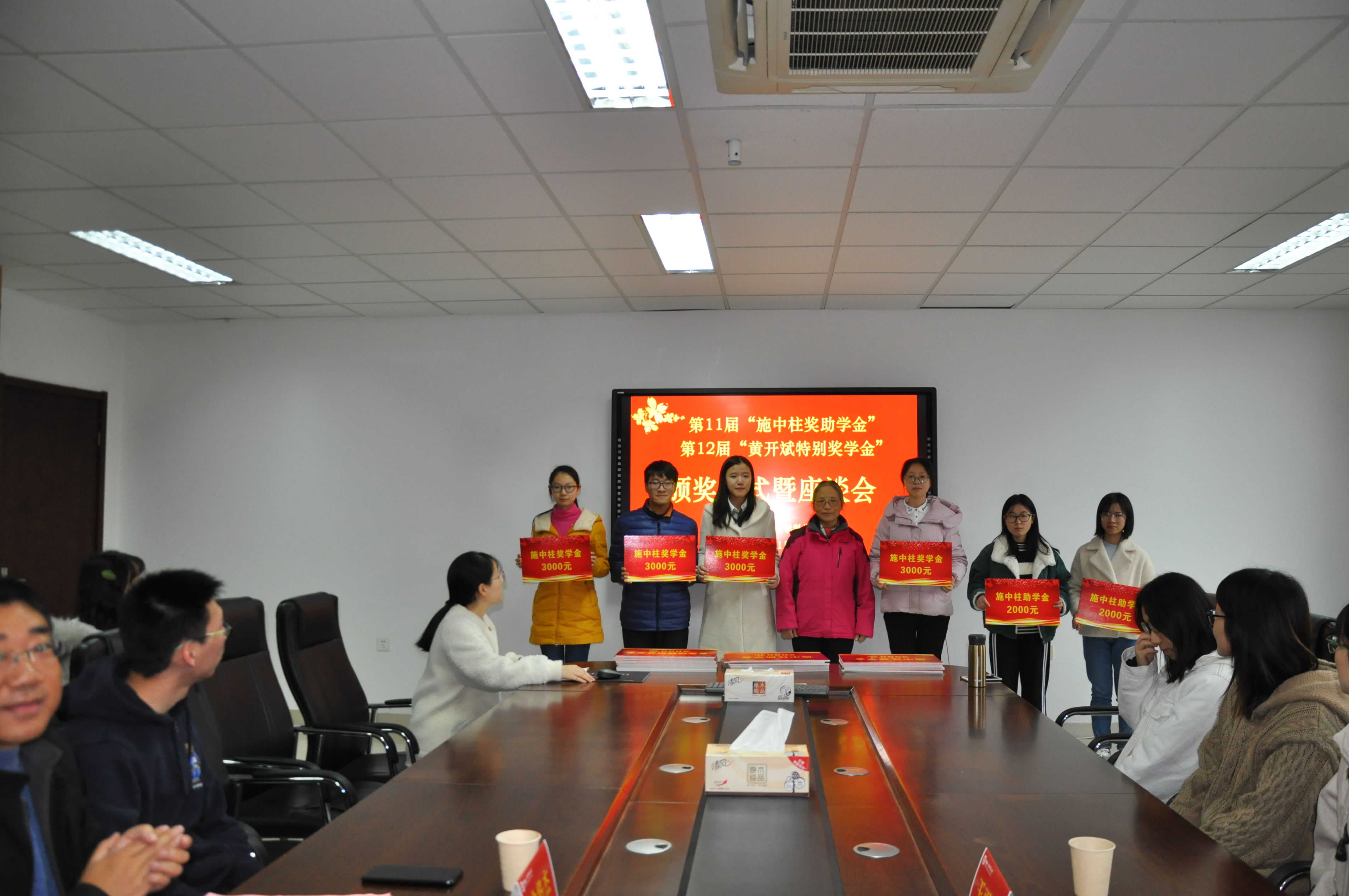 随后,数科院王雨顺副院长宣读了第11届“施中柱奖助学金”、第12届“黄开斌特别奖学金”获得者名单。经两项奖助学金评审委员会评审,数科院张佳惠等10名同学获得本届“黄开斌特别奖学金”;华旻珂等15名同学获得本届“施中柱奖学金”,施怡等5名同学获得“施中柱助学金”。在热烈的气氛中,三位嘉宾分别为获奖同学们颁奖并合影留念。