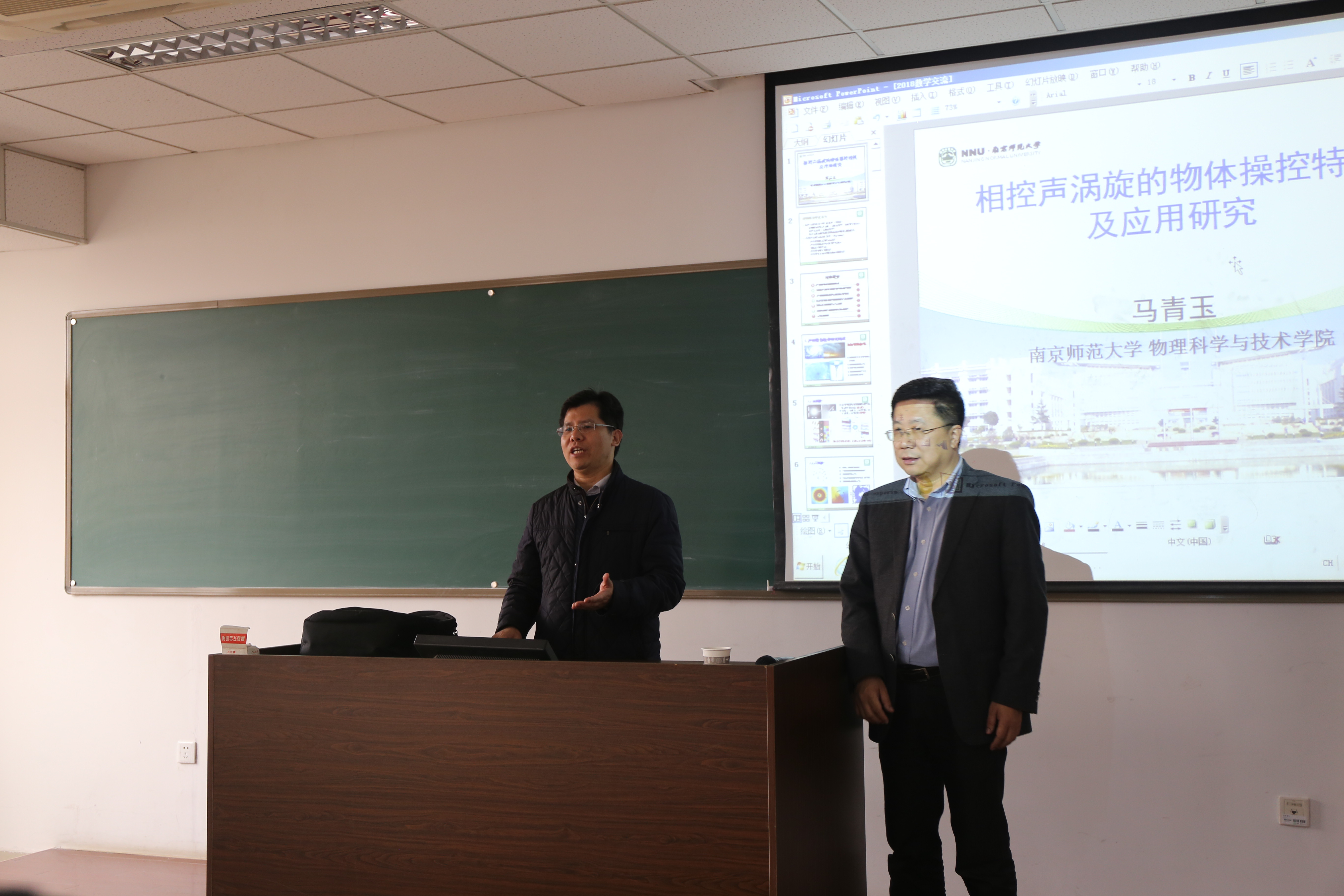 在本次报告会上,马青玉教授作了题为“相控声涡旋的物体操控特性及应用研究”的学术报告。马青玉教授首先介绍了利用相位编码技术形成可控声涡旋的基本原理以及该项技术在实际医疗的广阔应用前景,然后对多种编码方法产生的声涡旋分别从模拟和实验的角度进行了详细地展示和比较。