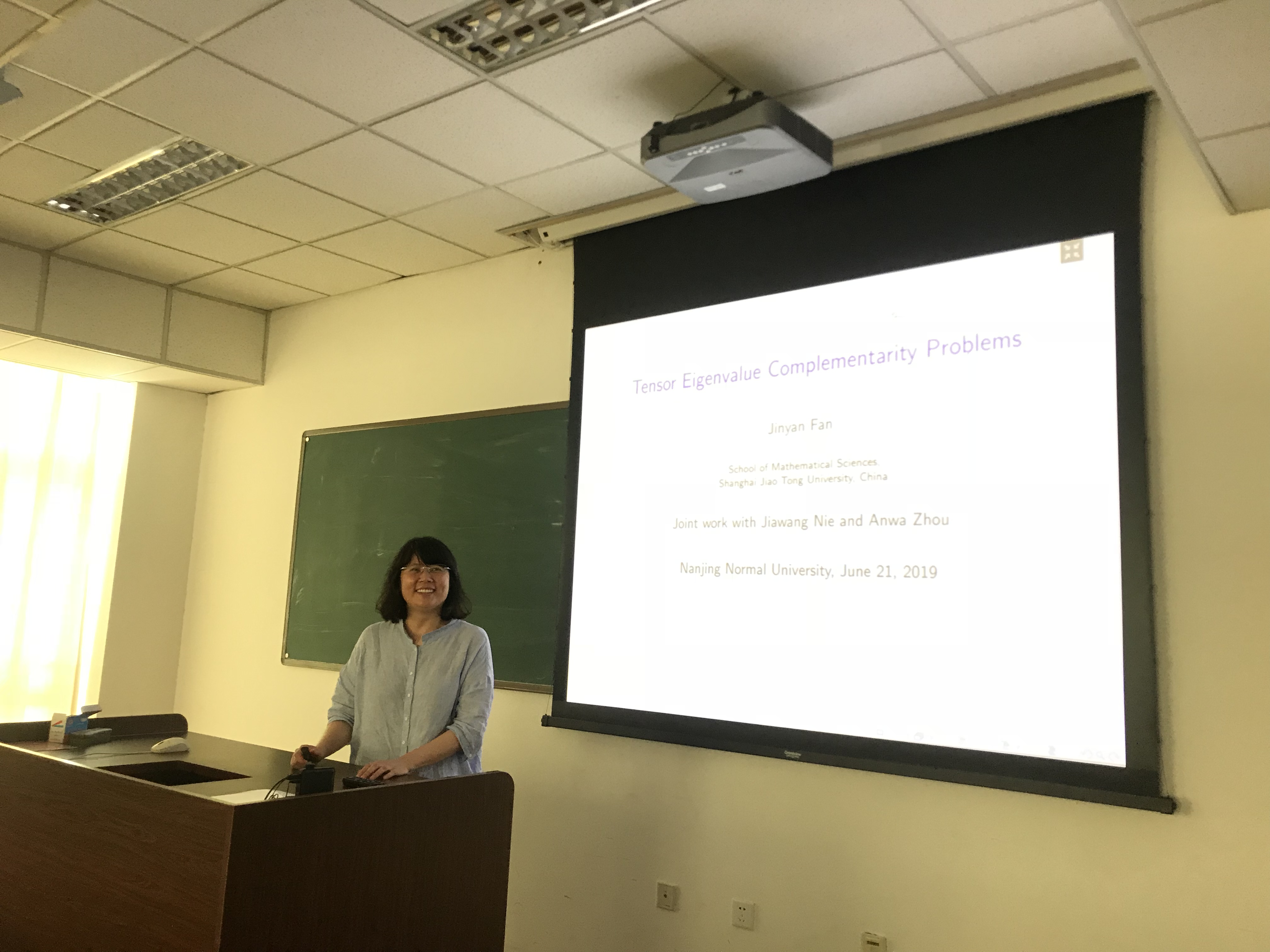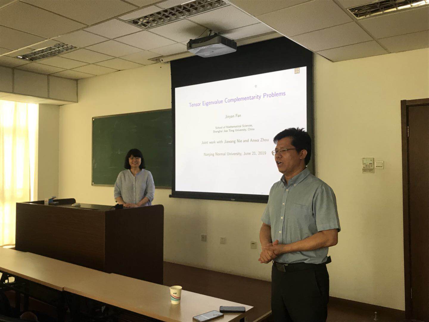本次报告会上,范金燕教授作了题为“Tensor Eigenvalue Complementarity Problems”的学术报告。范教授首先介绍了标准的张量特征值问题以及张量特征值互补问题,然后详细介绍了如何巧妙将所考虑的张量特征值互补问题转化为多项式优化问题,并如何基于Lasserre半定规划松弛技术求解所得到的多项式优化问题。最后,范教授介绍了所提出算法对于一般的张量特征值互补问题具有有限终止性,并向大家展示了一些数值算例,验证了所提算法的有效性。