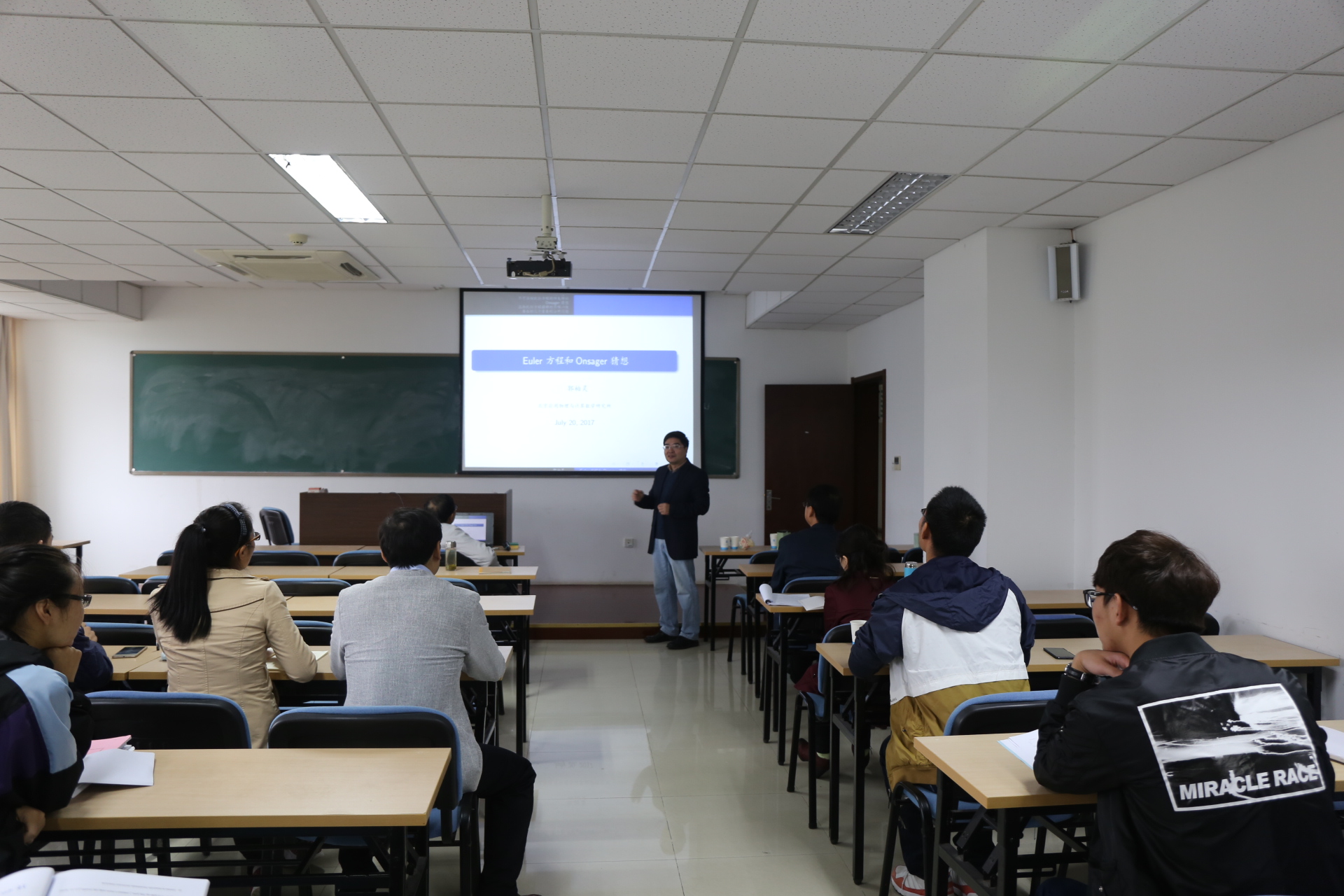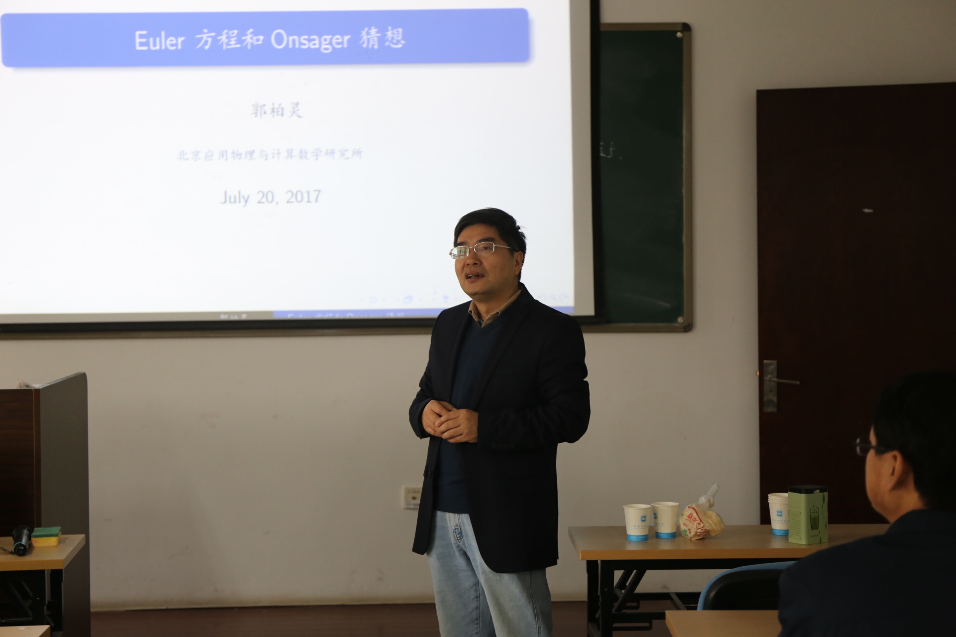 在本次报告会上,郭柏灵院士作了题为“Euler方程和Onsager猜想”的学术报告,报告主要有下面五个部分展开: ①欧拉生平;②不可压缩欧拉方程的四大特征;③Onsager猜想;④三维欧拉方程弱解的不唯一性;⑤存在的几个重要的公开问题。详细介绍了Euler方程,不可压缩流中的Euler方程是许多数学分支的源泉,线性PDE、动力系统、非线性PDE、几何PDE,调和分析和完全可积系统等数学分支皆可追根溯源到Euler方程上去,近到天气预报,远到超新星爆炸爆炸学说,Euler方程的影响已遍及数学之外的各个学说,郭院士还鼓励在座的研究生继续这方面的研究工作。