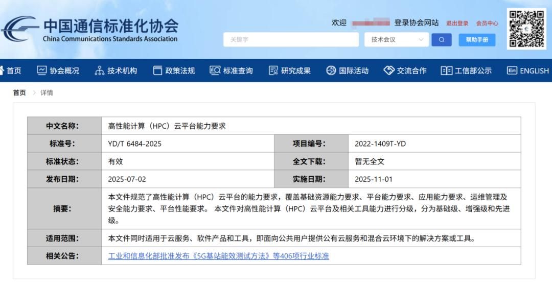 2025年7月2日,由中国信息通信研究院(以下简称“中国信通院”)牵头编制的《高性能计算(HPC)云平台能力要求》行业标准(标准号:YD/T 6484-2025)正式发布。