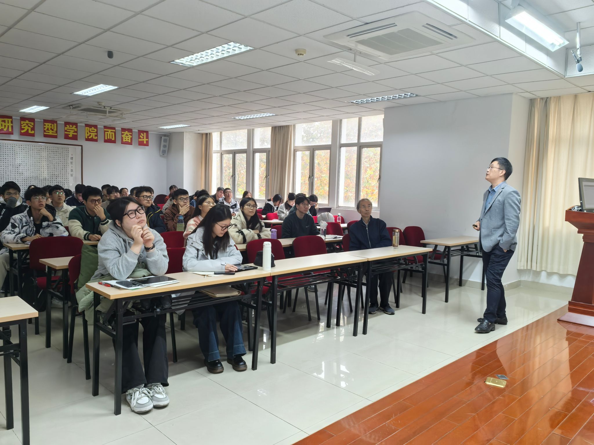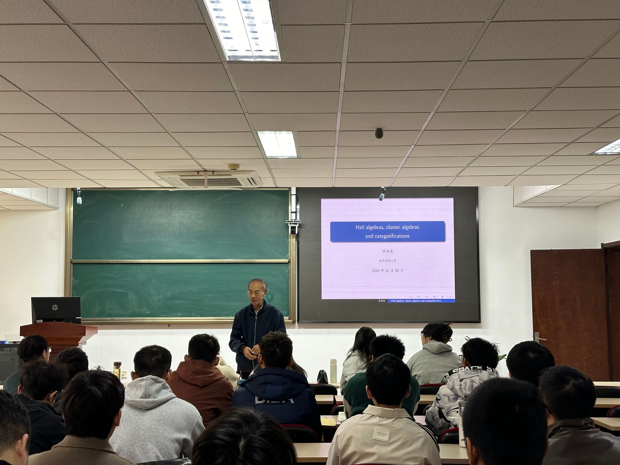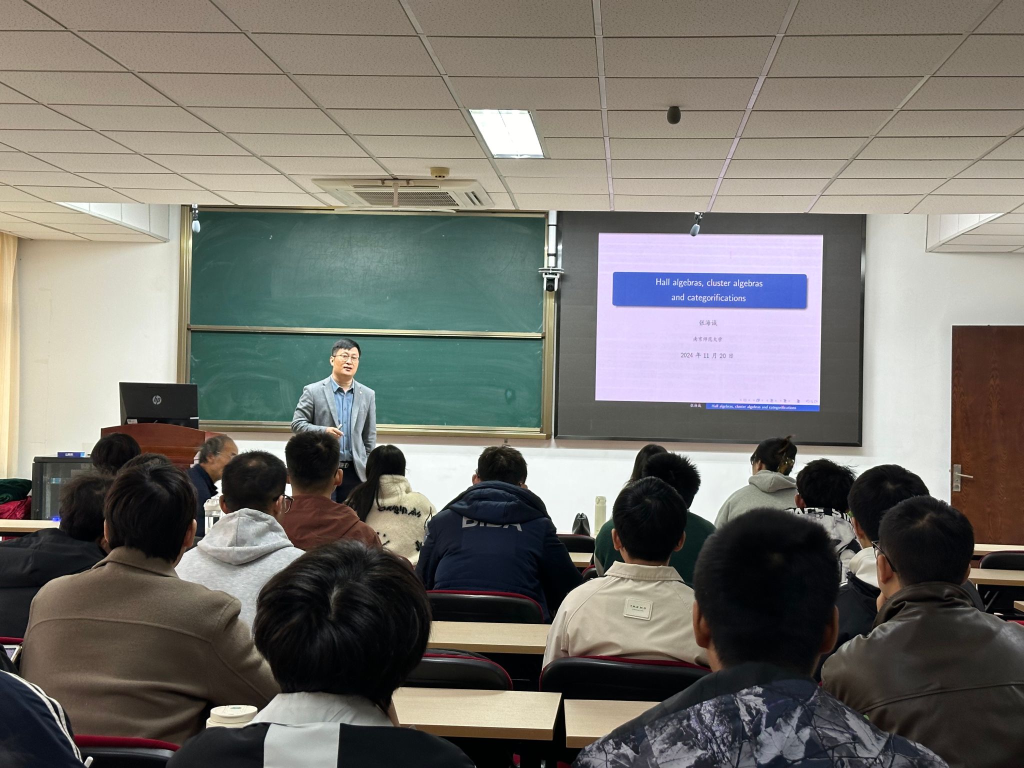 近年来,基于实际需要,代数研究越来越受到重视。在本次报告会中,张海诚副教授介绍了代数表示论与李理论、丛代数理论之间的交叉研究。具体地先从范畴的基本概念出发,说明对象与态射在代数结构中的核心作用,进而引入群、环与模等基本构造。通过详细介绍箭图表示、李代数、Hall代数、丛代数等概念,展开阐述Hall代数在李代数、量子群、量子丛代数的范畴化中的应用为我们展示代数结构的多样性和深刻性,指出了代数领域的前沿研究方向,介绍了自己在Hall代数、量子丛代数、范畴化等方面的一些研究成果。