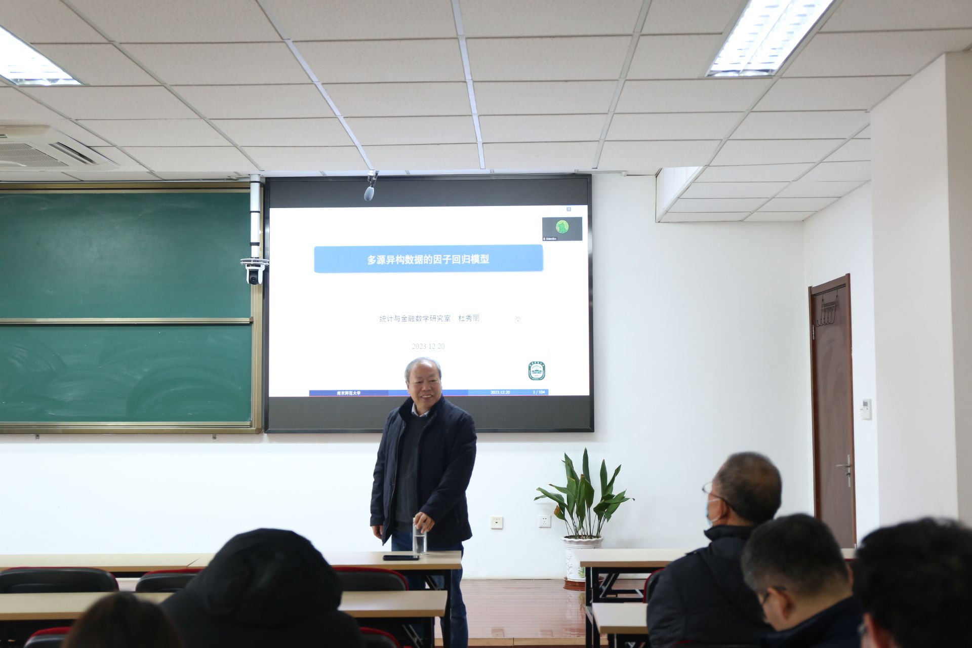 本学期第八场双周三学术报告会在行健楼学术活动室526举行。此次报告会的主讲人是统计与金融数学研究室的杜秀丽教授,报告的题目是“多源异构数据的因子回归模型”。数学研究所副所长贺伟教授主持了本次报告会。统计与金融数学研究室解锋昌教授、高启兵教授、米辉副教授、孙源副教授、刘正威博士以及部分研究生参加了本次报告会。