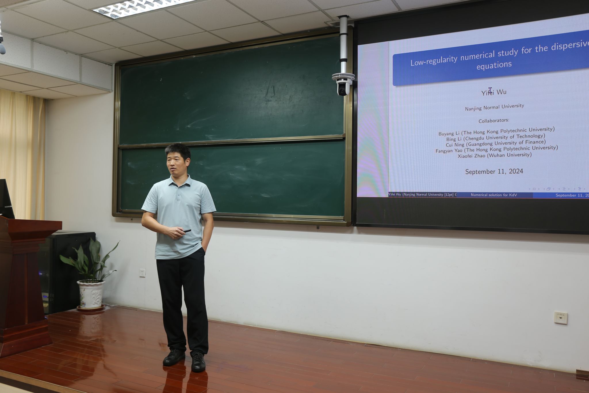 本学期第一场双周三学术报告会在行建楼学术活动室526举行。此次报告会主讲人是应用数学研究室的吴奕飞教授,报告的题目是“Low regularity Fourier integrators for some nonlinear dispersive equations”,数学研究所执行副所长尹会成教授主持了本次报告会。副所长张晓岩教授,应用数学研究室郭飞教授、刘亚东博士,现代分析研究室许刚教授、丁冰冰副教授,计算科学研究室蔡文君教授、蔡邢菊教授、姜波教授、孙海琳教授、王雨顺教授、徐玲玲副教授,几何代数研究室薛非副教授以及部分研究生参加了本次报告会。