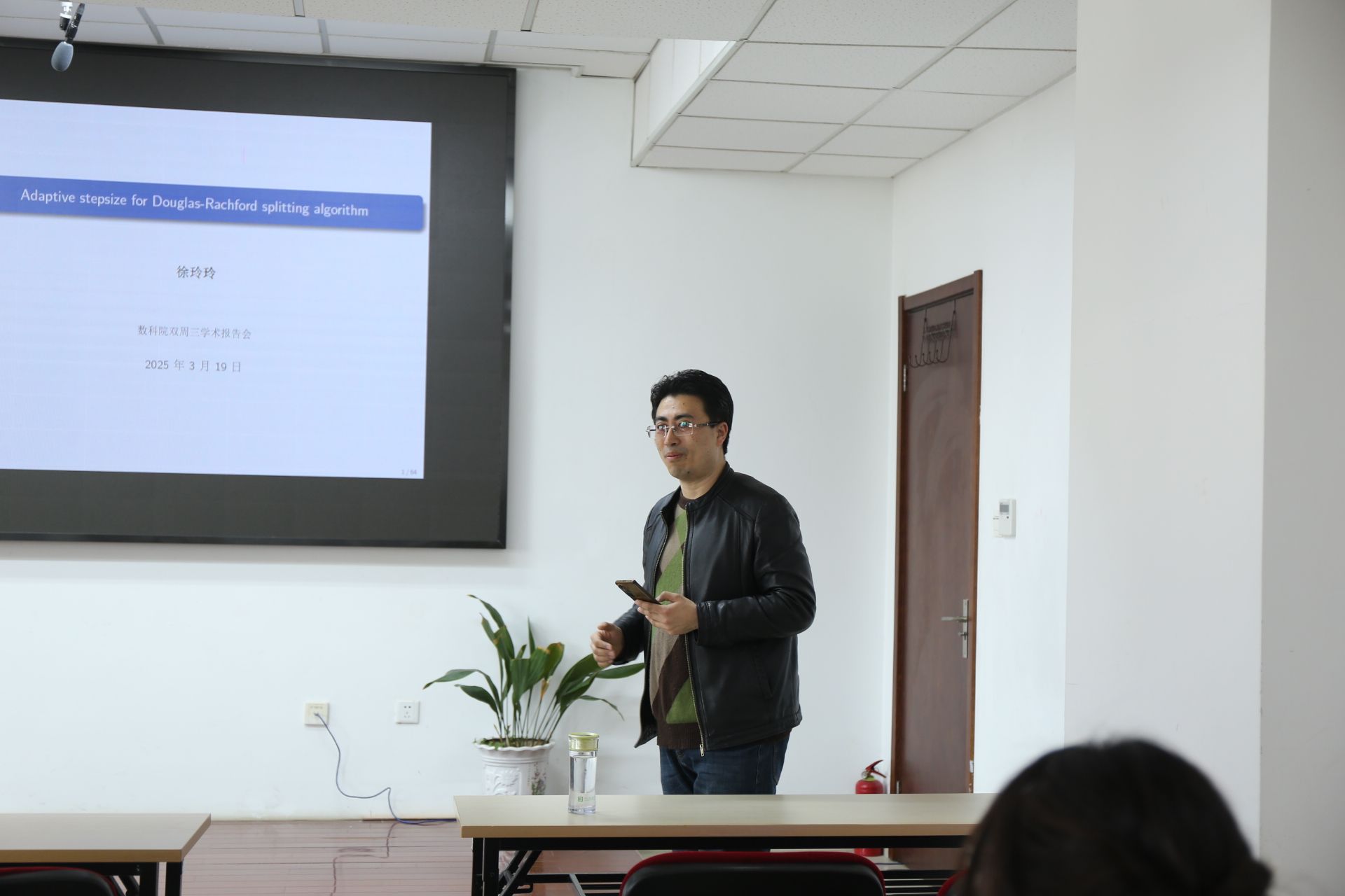 本学期第二场双周三学术报告会在行健楼学术活动室526举行。此次报告会主讲人是计算科学研究室的徐玲玲副教授,报告的题目为“Adaptive stepsize for Douglas-Rachford splitting algorithm”(Douglas-Rachford分裂算法的自适应步长策略)。数学研究所副所长张晓岩教授主持了本次报告会。计算科学研究室蔡文君教授、蔡邢菊教授、姜波教授、王锋教授、王雨顺教授、孙越泓副教授、谈雪媛副教授以及部分研究生参加了本次报告会。
