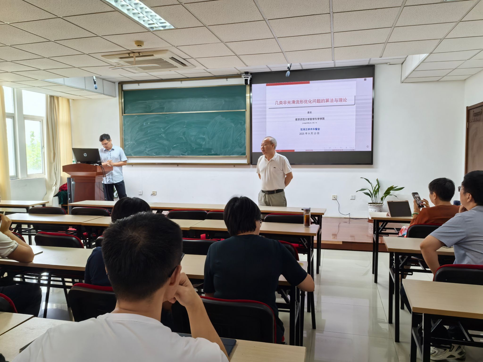 本学期第一场双周三学术报告会在行建楼学术活动室526举行。此次报告会主讲人是计算科学研究室的姜波教授,报告的题目是“几类非光滑流形优化问题的算法与理论”,数学研究所副所长贺伟教授主持了本次报告会。数学研究所副所长吴奕飞教授、张晓岩教授,几何代数研究室陈慧斌副教授、方金辉教授,现代分析研究室许刚教授,计算科学研究室蔡邢菊教授、蔡文君教授、南彩霞博士、孙越泓副教授、谈雪媛副教授、王丽教授、王雨顺教授、徐玲玲教授、徐缘副教授,应用数学研究室何跃副教授、杨云博士,运筹控制研究室常虹副教授、戴国伟副教授、杜佳丽副教授、李婷副教授,金融统计研究室杜秀丽教授、高启兵教授、孙海琳教授、孙源副教授、孙志斌教授、吴琼博士、周秀轻教授以及部分研究生参加了本次报告会。