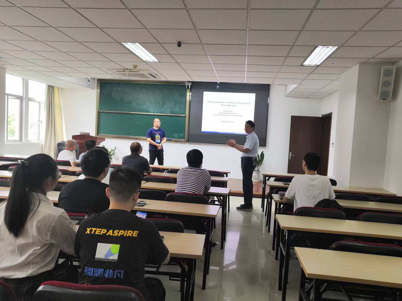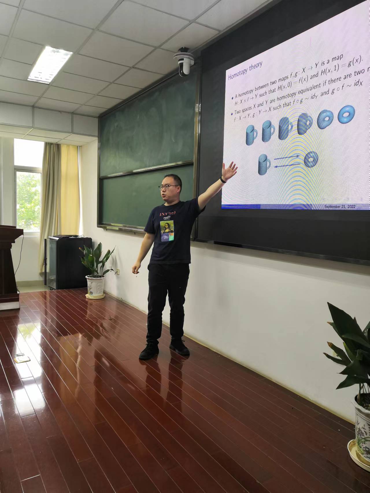 本学期第二次双周三学术报告在行建楼526举行。此次报告主讲人是几何代数研究室的段智鹏博士,报告的题目是“Vanishing lines in chromatic homotopy theory and its applications”,数学研究所执行副所长尹会成教授主持了本次报告会,数学研究所副所长贺伟教授,几何代数研究室纪春岗教授、陈慧斌副教授、张海诚副教授、薛非博士,金融数学研究室刘正威博士,以及*女王调教-女王调教视频-女王 调教小说部分研究生参加了本次报告。