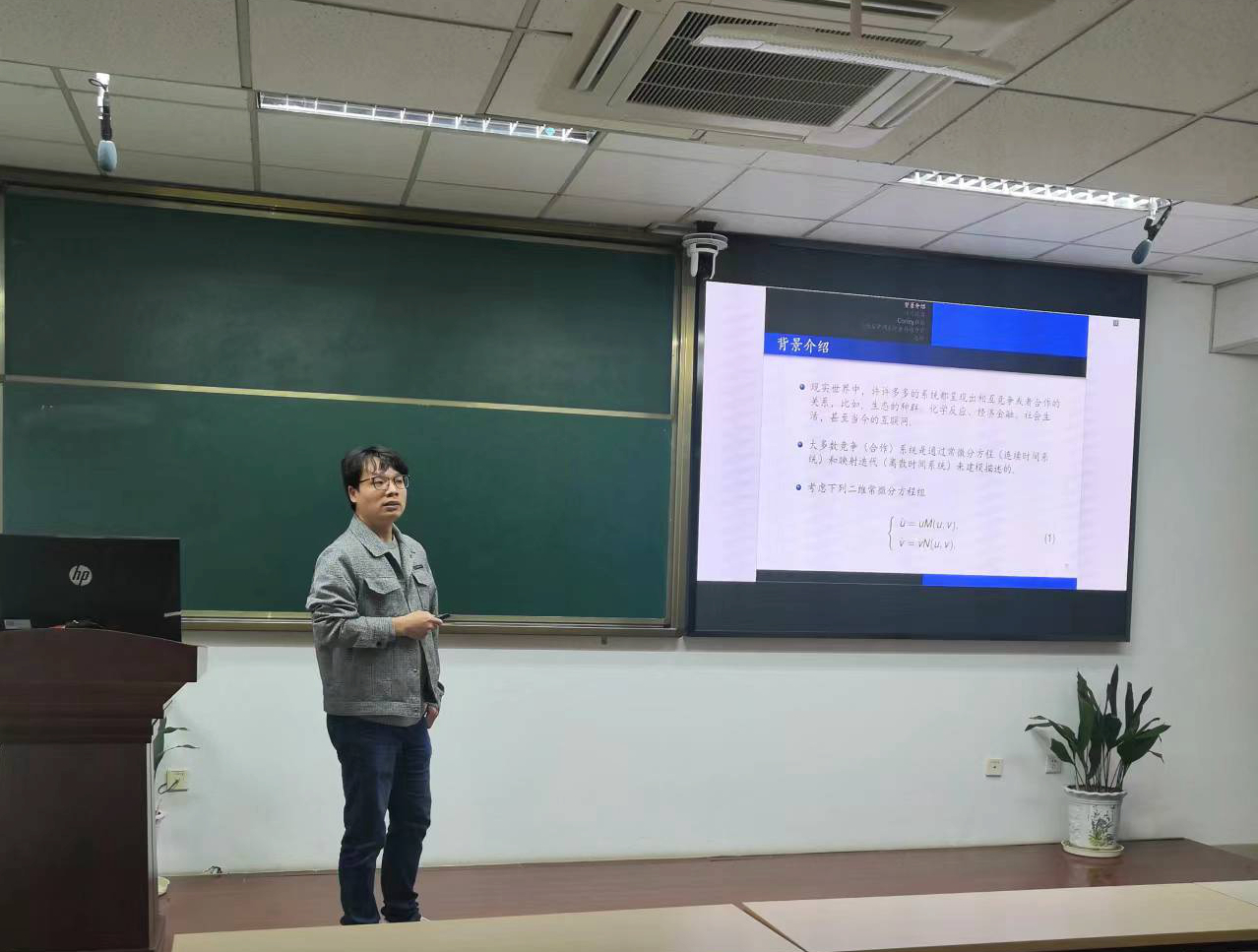 本学期第五次双周三学术报告会在行建楼526举行。此次报告主讲人是现代分析研究室的孙孟锋博士,报告的题目是“Global dynamics of a three-dimensional nonmonotone system and Conley index”,数学研究所副所长陈永高教授主持了本次报告会,*女王调教-女王调教视频-女王 调教小说部分研究生参加了本次报告。