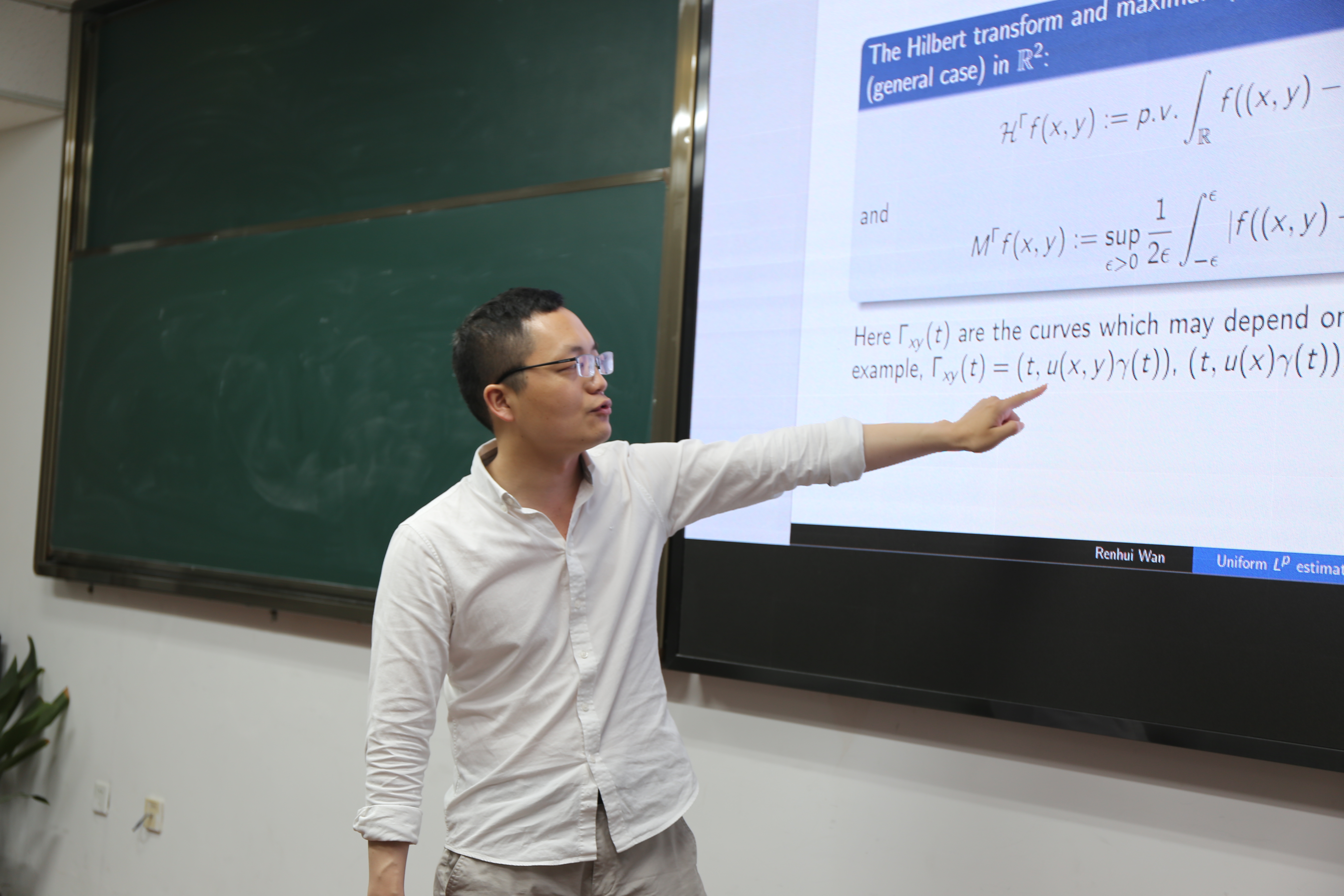 万仁辉副教授首先介绍了沿可变曲线希尔伯特变换和极大算子的基本形式,并且与沿固定曲线的情形做了详细对比,提出了不同之处与难点所在。然后介绍了相关的历史背景包括与方程中变系数情况的一些联系、相关Stein和Zygmund的重要猜想以及最新带有非零曲率的相关研究成果。最后给出了主要成果的证明框架,其中具体介绍了证明中所使用的时频分析技术、振荡积分理论中的驻相法和非驻相法。最后还提到了一种新的关键的估计分离集合的技术,并简要介绍了证明过程。报告的最后对相关问题进行了一些展望。