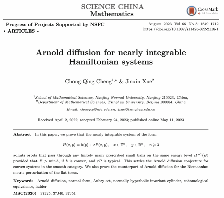 程崇庆教授与清华大学薛金鑫教授联合发表于《中国科学:数学(英文版) 》2023年第8期的论文“Arnold diffusion for nearly integrable Hamiltonian systems”入选。