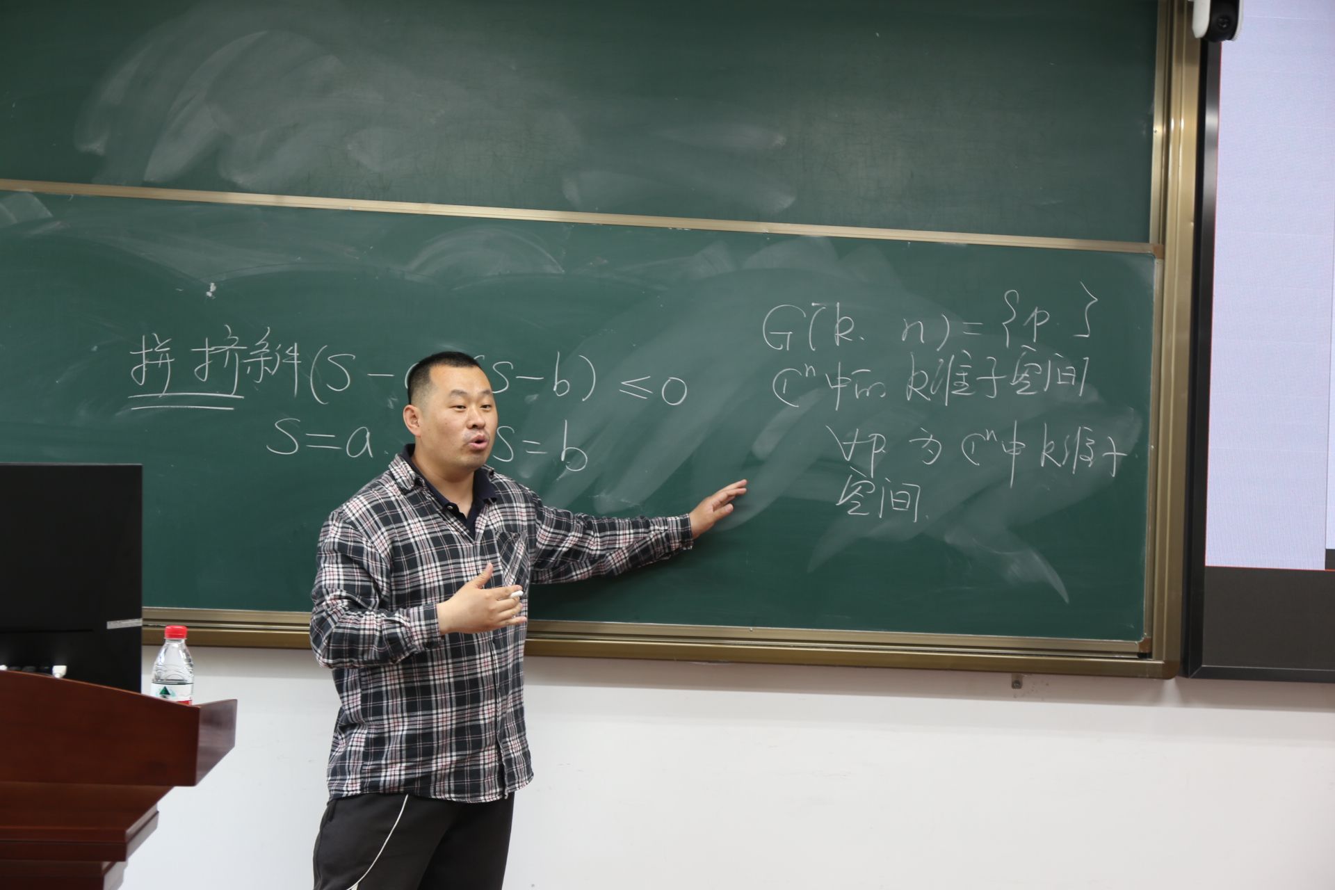 王军副教授在本次报告中生动形象地介绍了“拼挤”以及“复Grassmamn流形(G(k,n))”的概念,并由此介绍了如下研究成果:目前已经找到五类拼挤常曲率全纯二维球面的“基石”,并可以通过直和得到任意G(n,k)的拼挤常曲率全纯二维球面。对于反问题:任意G(n,k)的拼挤常曲率全纯二维球面是否可以由这五类“基石”直和得到?对于G(2,N),G(3,N)以及非退化的G(4,8)均已被证明可以。王军副教授指出对于更高层次的复杂Grassmamn流形G(5,N)的证明还在研究中。
