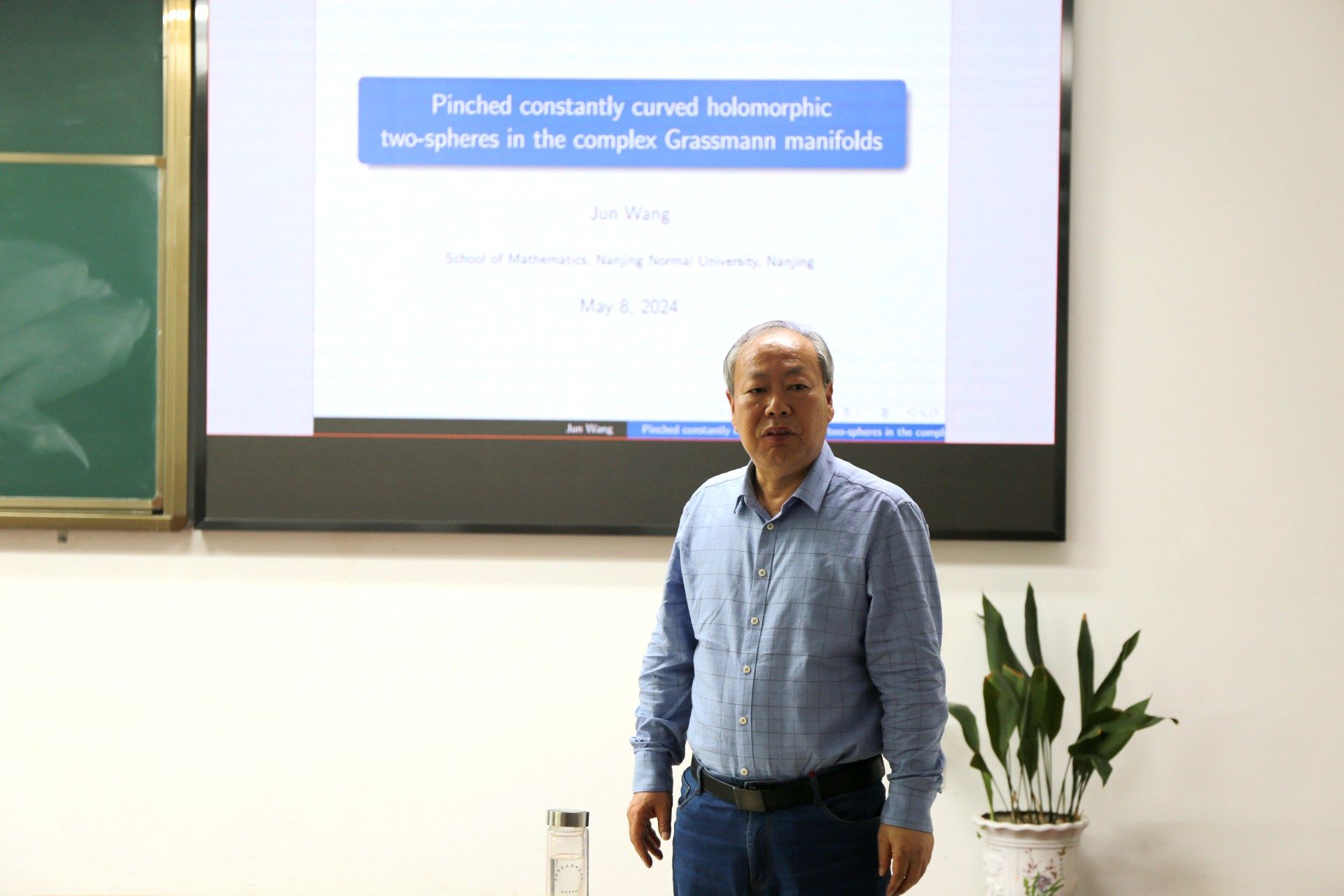 本学期第五场双周三学术报告会在行健楼学术活动室526举行。此次报告会的主讲人是几何代数研究室王军副教授,报告的题目是“Pinched constantly curved holomorphic two-spheres in the complex Grassmann manifolds”,数学研究所副所长贺伟教授主持了本次报告会,几何代数研究室方金辉教授和部分研究生参加了本次报告会。