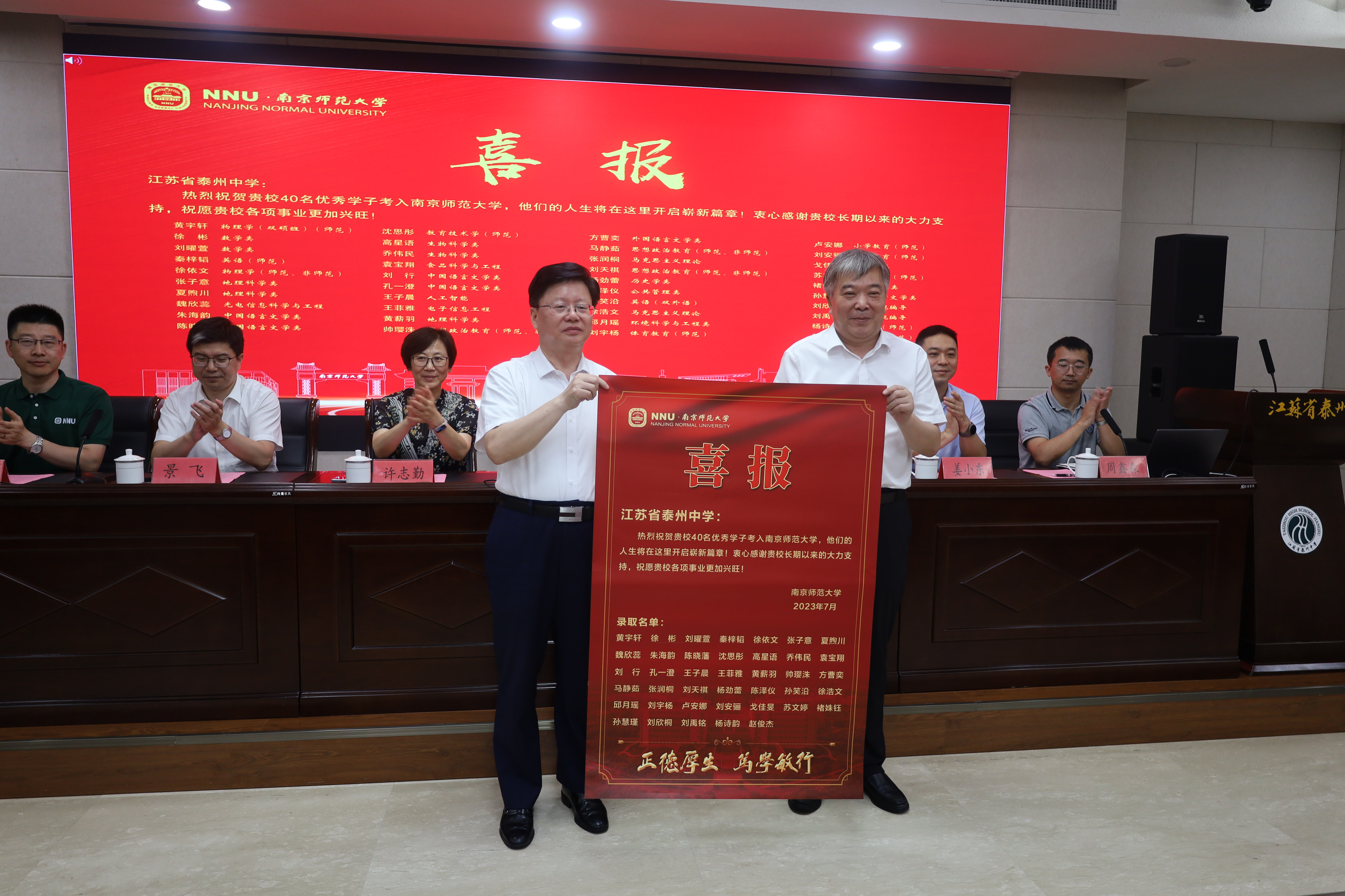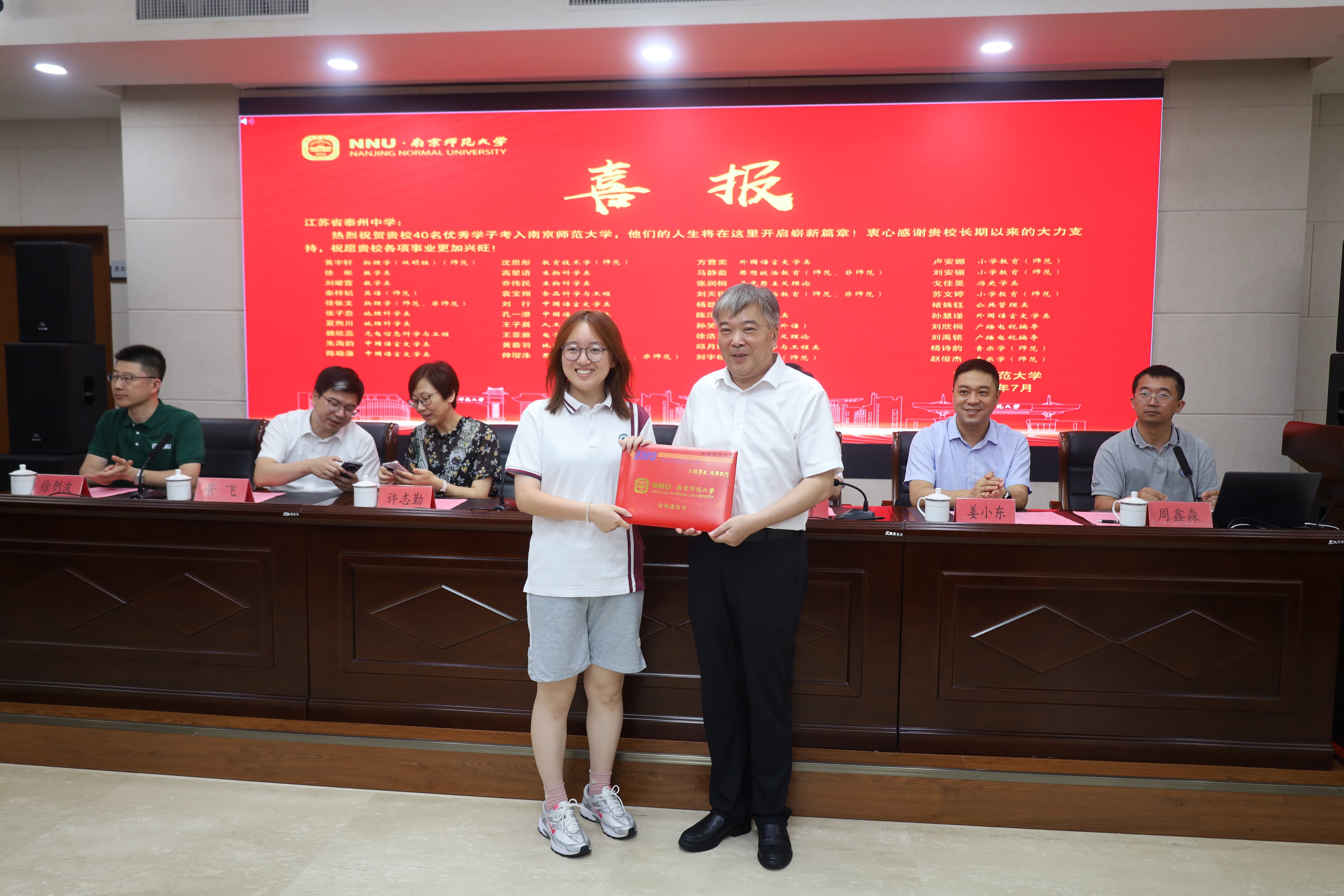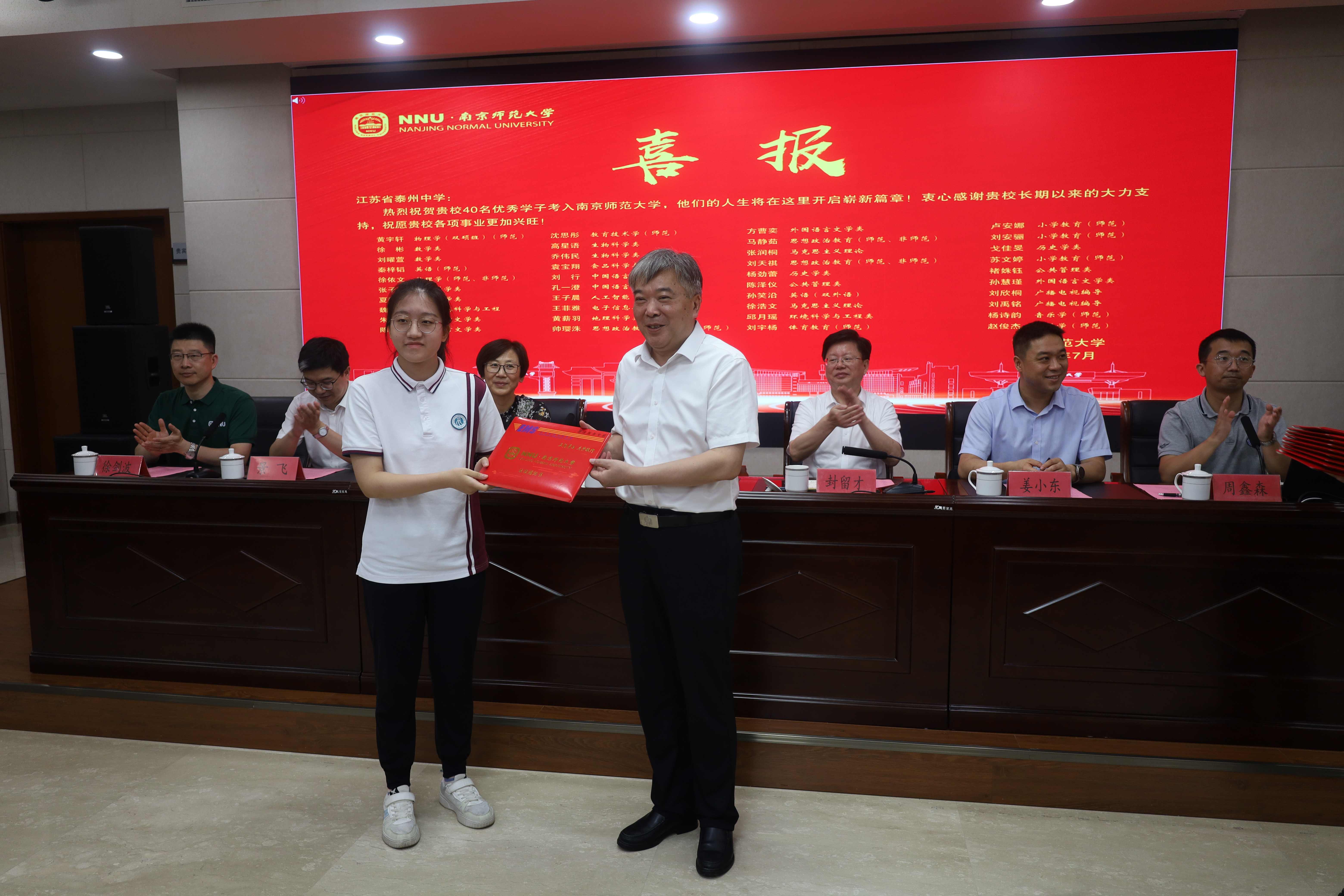 感谢泰州中学的同仁们对南师大事业发展的大力支持,感谢泰州中学学生和家长们对南师大的认同和信任,并对被录取的新生同学们表示热烈的祝贺。讲话中,他简要介绍了百廿南师的灿烂历史,列举了近年来南师大各项事业发展中取得的瞩目成就,特别从南师大120周年校庆前夕,习近平总书记对全校师生给予的“弘扬优良传统,作出更大贡献”指示勉励,结合南师“厚生”精神做了深刻而详细的解读,希望新生同学们,树立高远志向,不负时代韶华,勇于责任担当,绘就精彩人生。