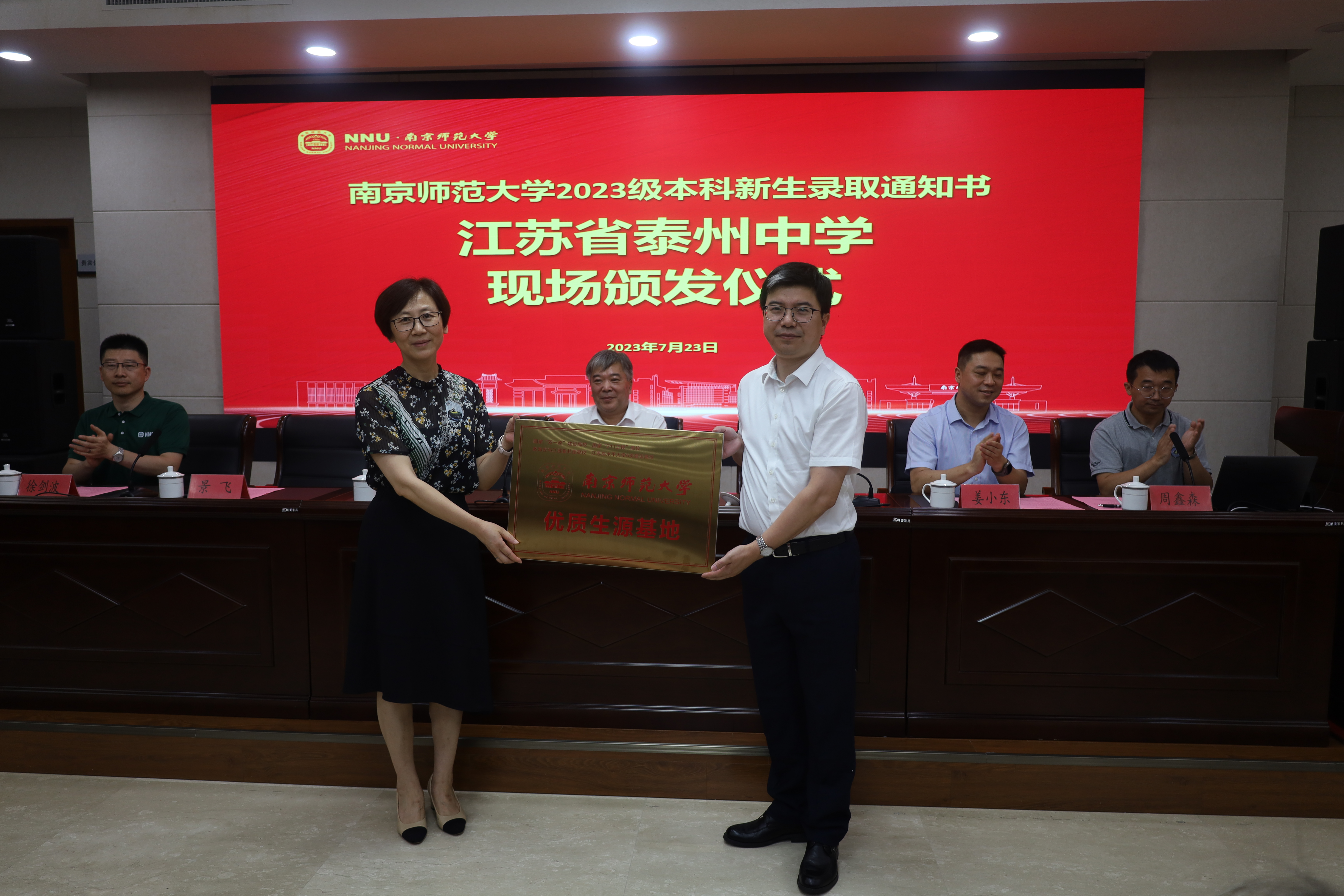 学生工作处景飞处长向江苏省泰州中学许志勤副校长赠授了优质生源基地铜牌。新生代表、录取在数学类专业的刘曜萱同学在颁发仪式上做了发言,她由衷感谢泰州中学校领导、老师们的三年来的辛勤培育,并表示在今后的南师学习中坚持不懈,刻苦钻研,学出成就,报效祖国。