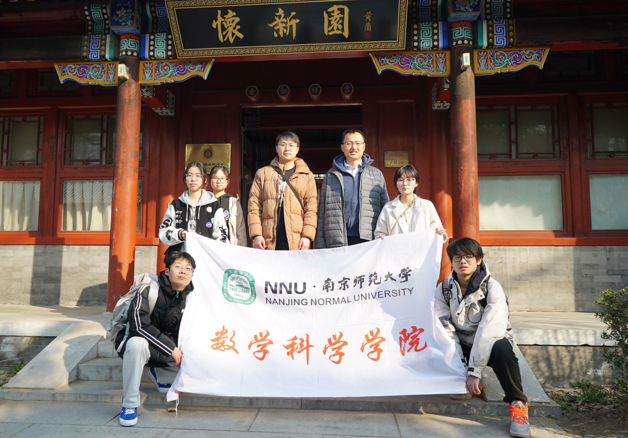 师生代表团和北京大学张磊教授在北京国际数学研究中心前合影