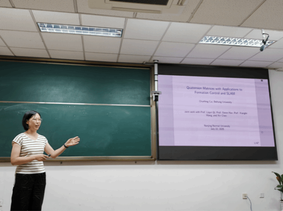 研讨会共设14专题报告和4场主题研讨,内容涵盖对偶四元数矩阵、随机优化算法、联邦学习、双层优化等前沿热点。北京航空航天大学崔春风教授阐述了对偶四元数在SLAM和编队控制中的创新应用;谢家新教授提出的“增强随机Douglas-Rachford方法”通过改进采样策略与自适应动量技术,显著提高了算法效率,引起广泛关注。南京工业大学胡乐宇、北京航空航天大学李婷、南京师范大学王茂然等青年学者也分别就分裂算法、随机增广拉格朗日方法等方向报告了最新研究成果。